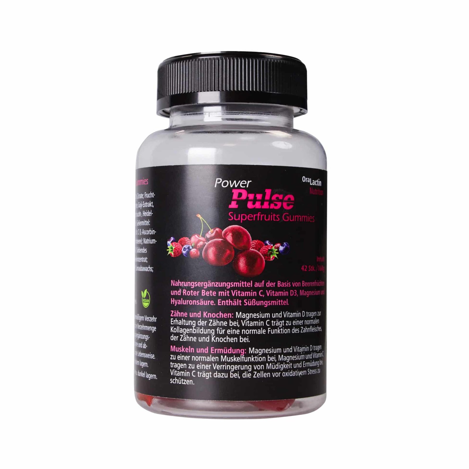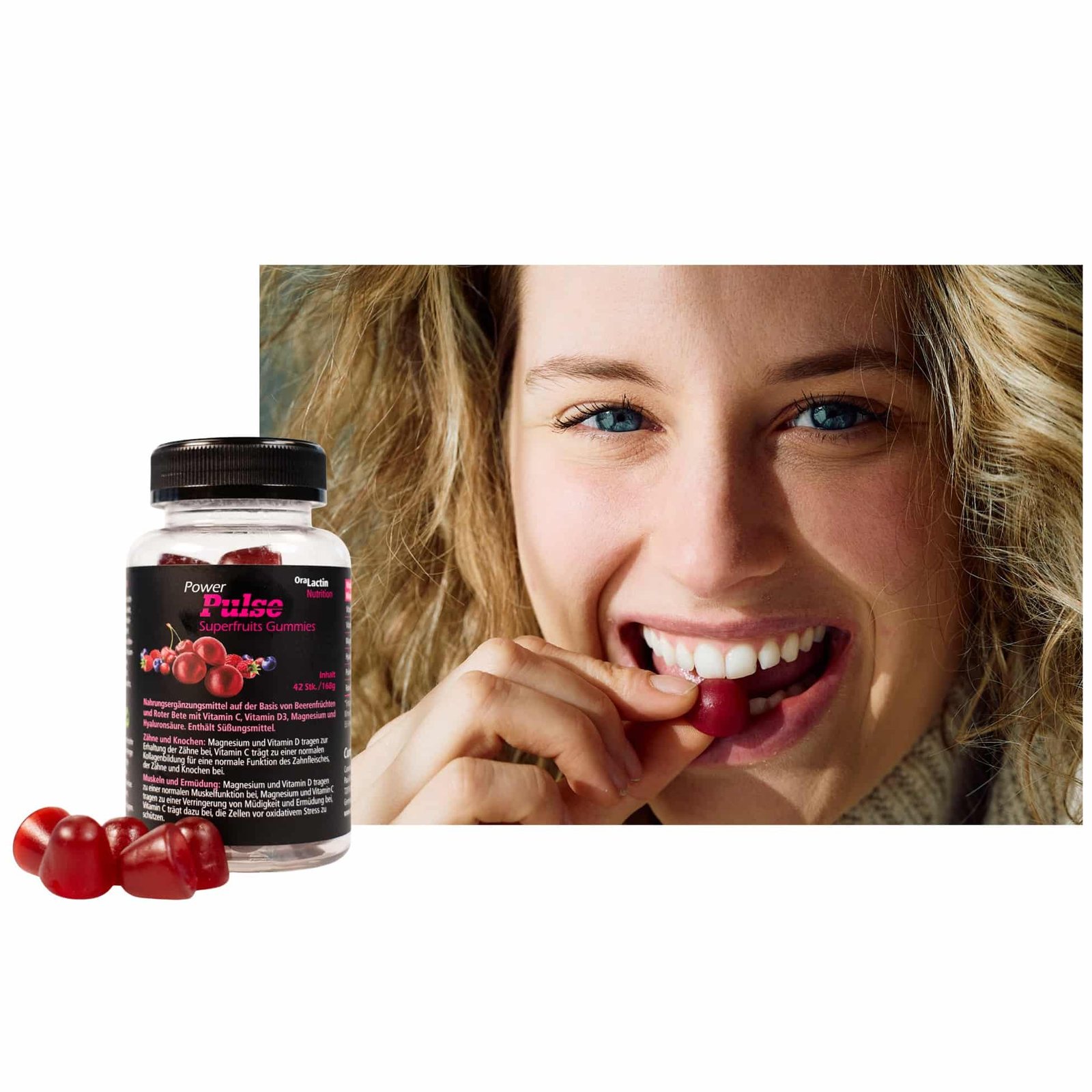 Maisto papildas guminukų forma su vaisių ir burokėlių mišiniu, vitaminu C, vitaminu D3, magniu bei hialurono rūgštimi. Be cukraus ir želatinos, malonaus vaisinio skonio, patogus kasdieniam vartojimui.